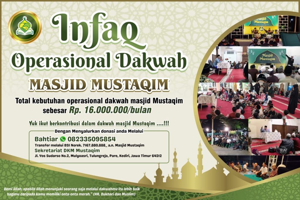 Infaq operasional adalah salah satu cara untuk mendukung kegiatan dakwah dan menyebarkan ajaran Islam. Dengan memberikan Infaq operasional masjid Mustaqim maka anda sudah membantu menjalankan kegiatan dan program-program yang dapat membantu umat Islam. Infaq operasional ini juga bisa menjadi bentuk ibadah yang terus mengalir pahalanya, karena kegiatan dakwah yang didukung oleh Infaq tersebut dapat memberikan manfaat jangka panjang.