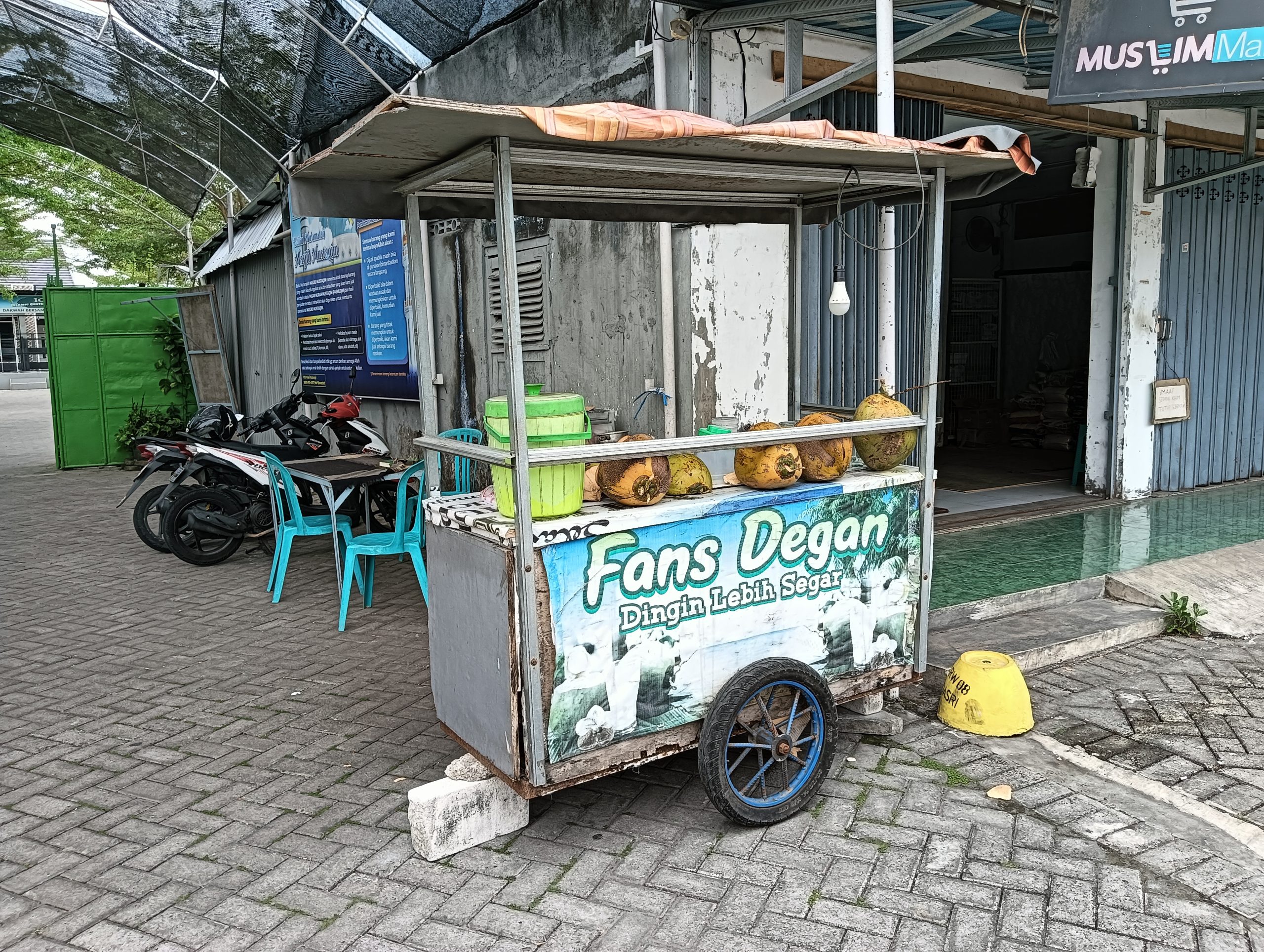 Terdapat Kios Es Degan kelapa muda yang sangat enak, menyehatkan dan segar yang dapat membuat badan lebih berenergi dan bersemangat dalam beribadah di Masjid Mustaqim.